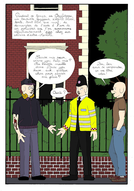 Nouvelle saison, nouveau style, nouvelles couleurs. Une fois n'est pas coutume, j'entame cette quatrième saison de mes Histoires cochonnes en faisant peau neuve. Cette dernière mue me permettra d'explorer de nouveaux horizons : sur le plan pratique, cela se traduit par l'utilisation d'un pinceau rechargeable Pentel à l'encre de Chine (non, je ne suis pas rémunéré par cette entreprise pour leur faire de la publicité...) et d'une tablette graphique ; sur le plan visuel, qu'il s'agisse du dessin, de la taille des cases, de leur agencement ou de mon écriture, j'ai tout simplement décidé de changer de format, ce qui rendra mes vignettes plus lisibles, notamment sur un écran d'ordinateur ; enfin, sur le fond, je continuerai d'explorer différentes formes d'humour tout en rendant hommage à d'autres œuvres - sur ce point, je vous réserve d'ailleurs une petite surprise... En attendant, bon strip à toutes et à tous et que le porc soit avec vous !